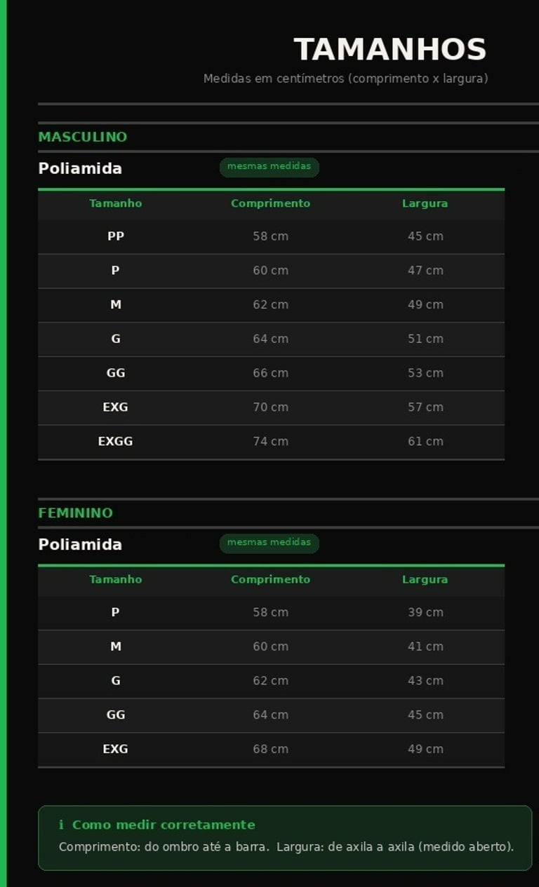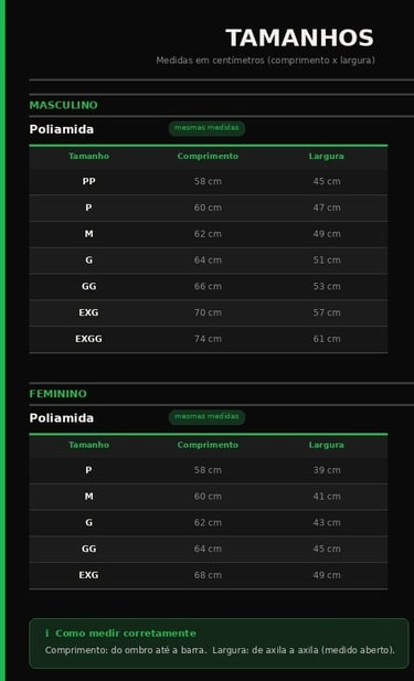 Tamanhos disponíveis: PP, P, M, G, GG, EXG e EXGG.