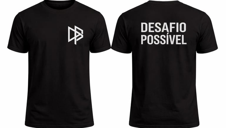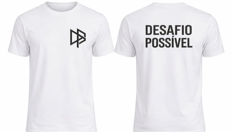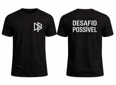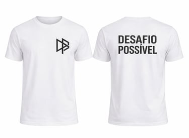 O Produto: Camisetas de alta qualidade (Preta ou Branca) com a marca de quem sabe que o "Impossível" é apenas um prazo que ainda não vencemos.